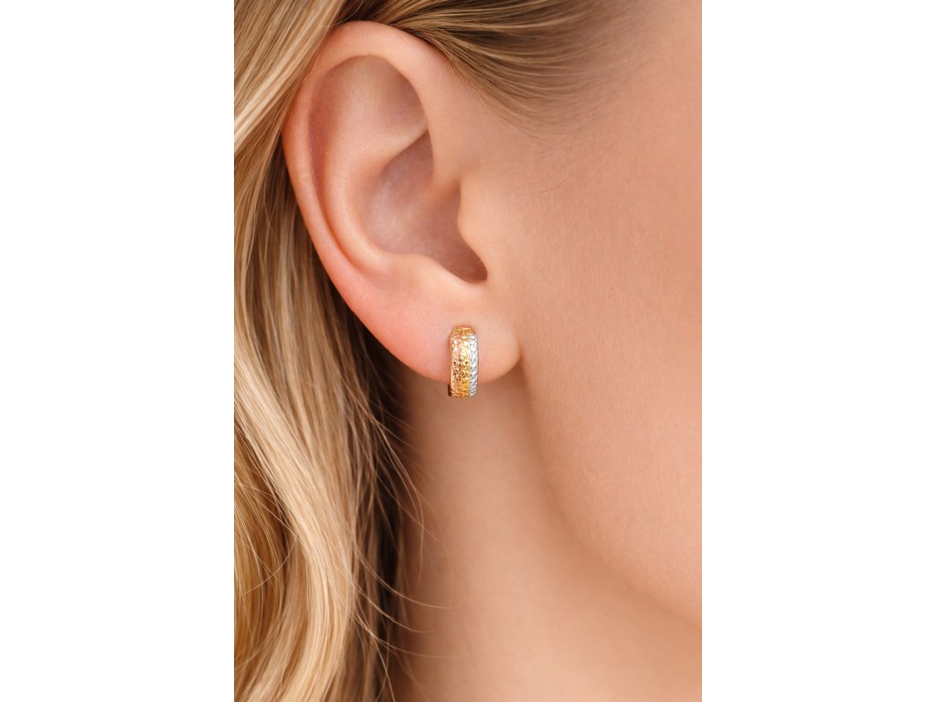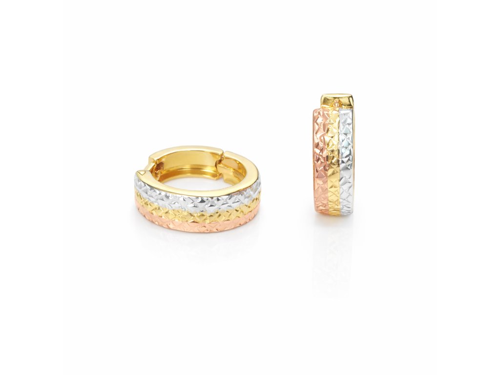 Elegantní kruhové náušnice v nadčasovém designu kombinují tři odstíny zlata – růžové, žluté a bílé. Jemně broušený povrch vytváří decentní třpyt, který krásně zachycuje světlo a zvýrazňuje strukturu jednotlivých pruhů. Díky praktickému zapínání perfektně sedí na uchu a jsou ideální pro každodenní nošení i slavnostnější příležitosti. Harmonické spojení tří barev zlata z nich dělá univerzální šperk, který snadno sladíte s ostatními doplňky.